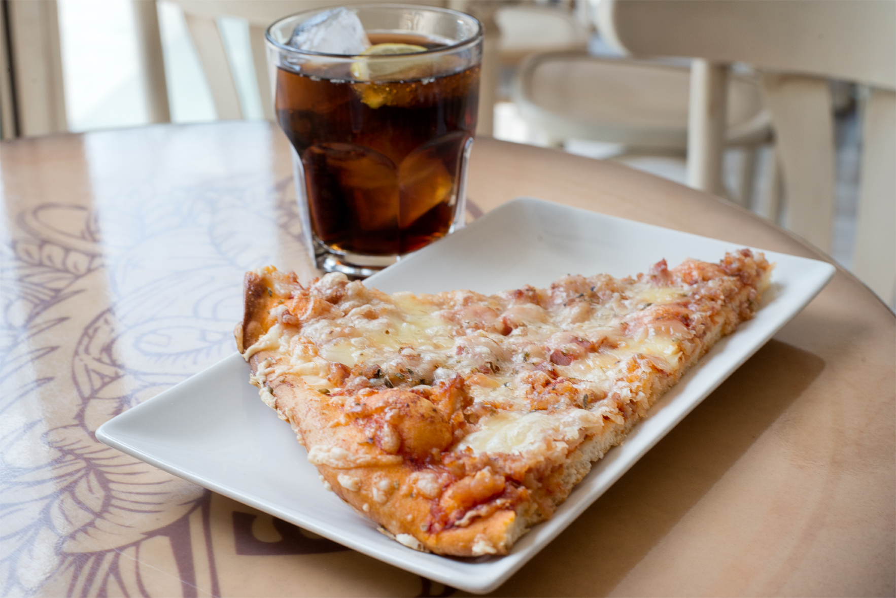 Variedad de bebidas y pizzas.